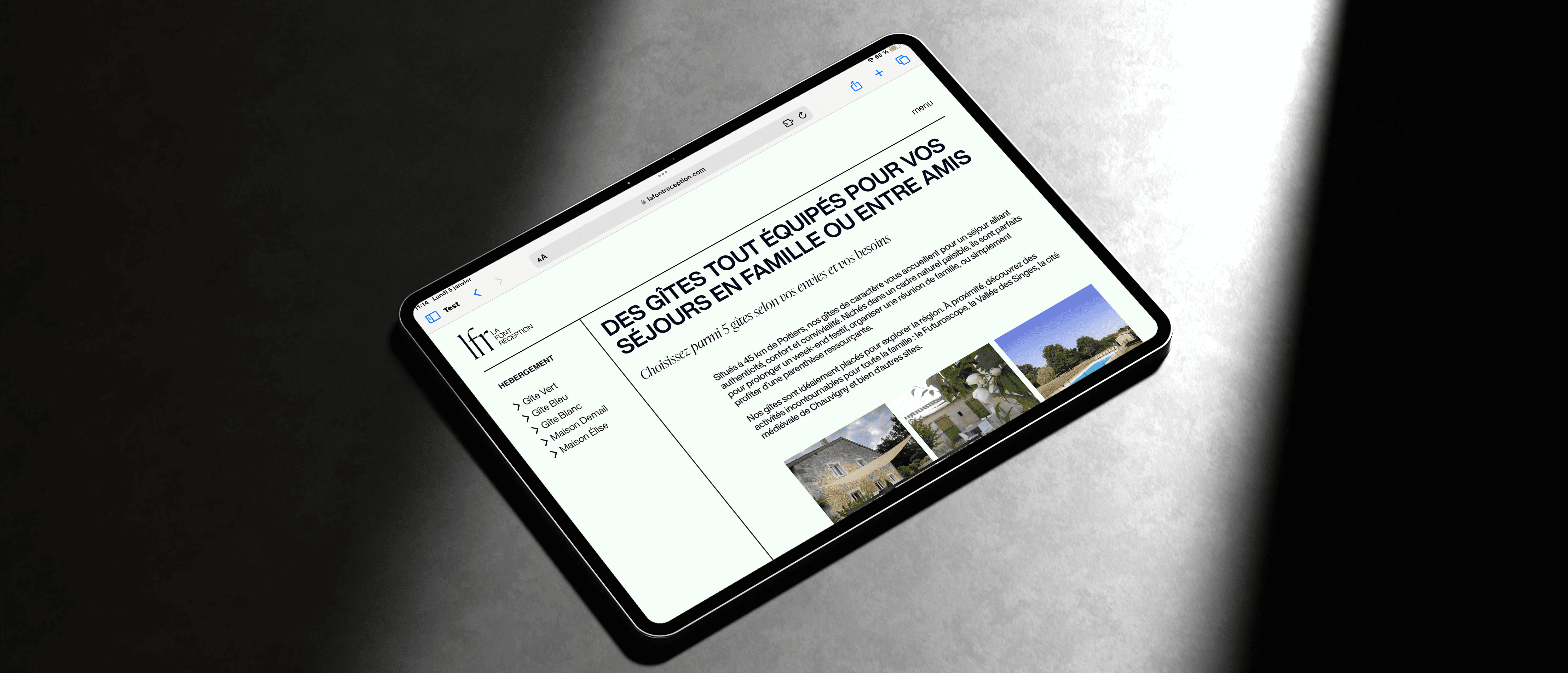 Suite au rebranding mené par le studio graphique Boom Peps, La Font Réception a souhaité aligner l’ensemble de ses supports avec cette nouvelle identité. Au-delà de l’enjeu graphique, le projet impliquait un important travail de réécriture et d’harmonisation des contenus, afin de clarifier l’offre : un domaine pensé à la fois comme lieu d’événements et comme gîte de location pour les séjours de vacances.